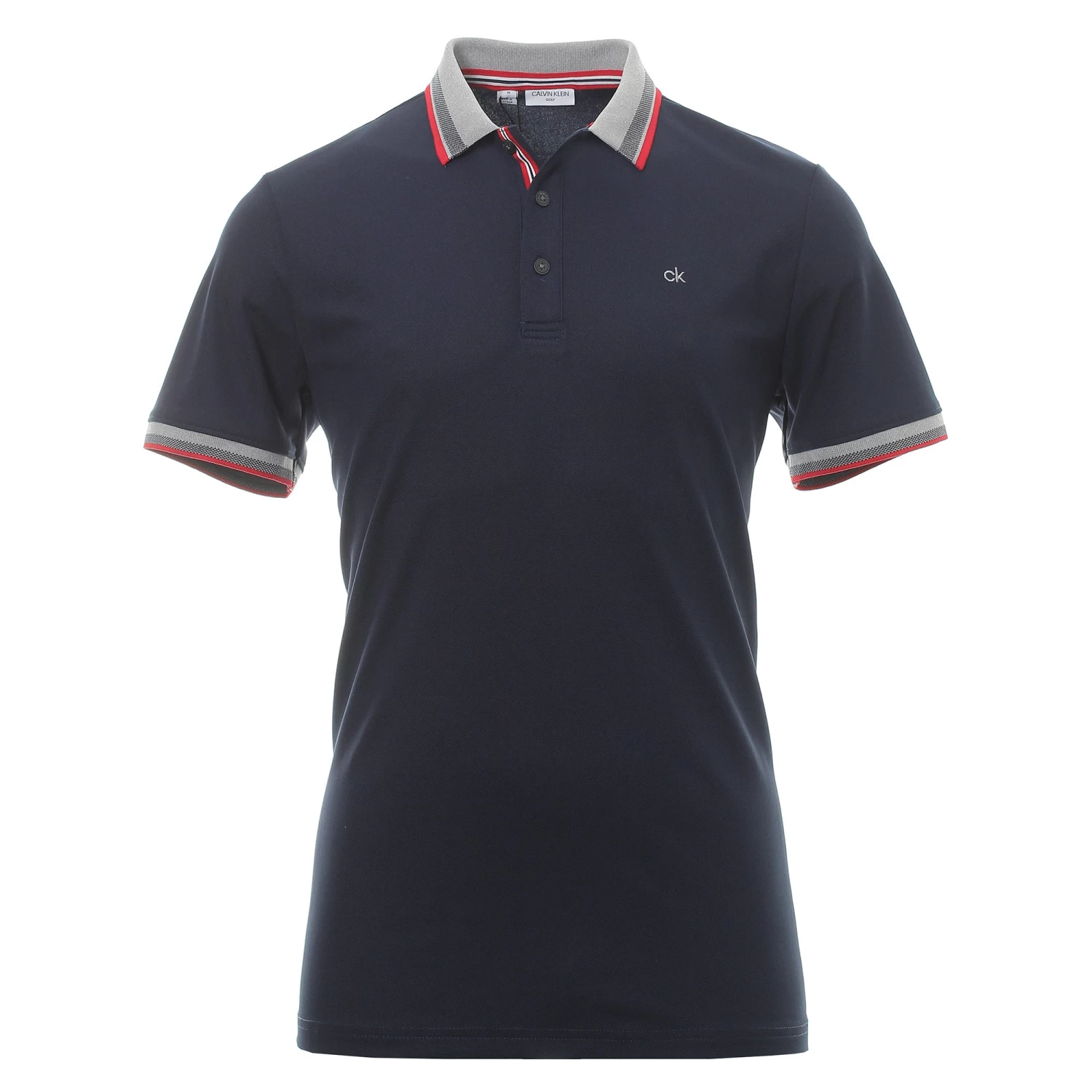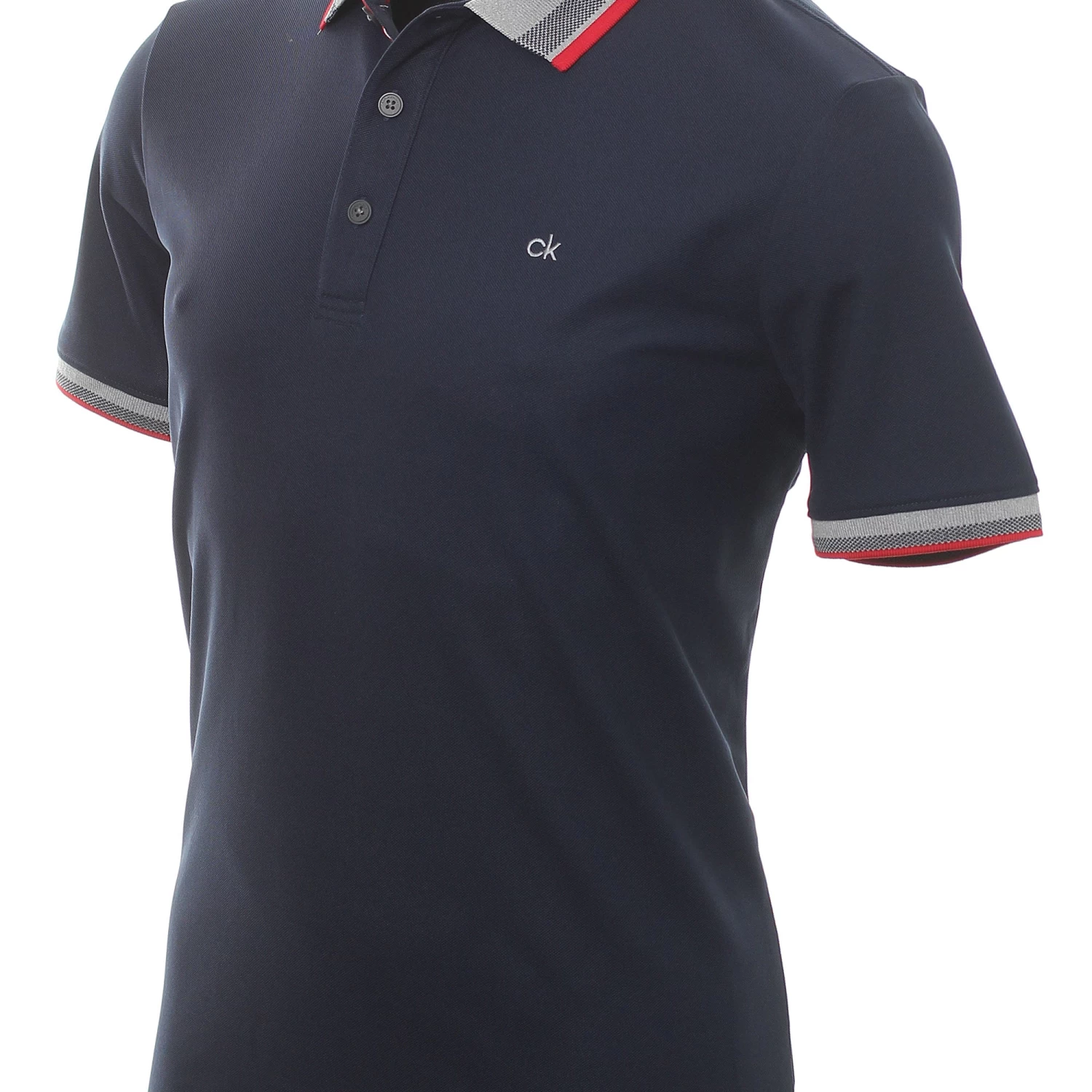 Mens Calvin Klein Spark Golf Polo Shirt. A classic, 3-button placket, pique golf polo shirt with contrast stripe design to rib knit collar and cuffs. Fabricated using SmartTec technology which provides extreme breathability and moisture movement properties to keep you cool and dry on the course, anti-bacterial properties, moisture management and UV30+ protection.
