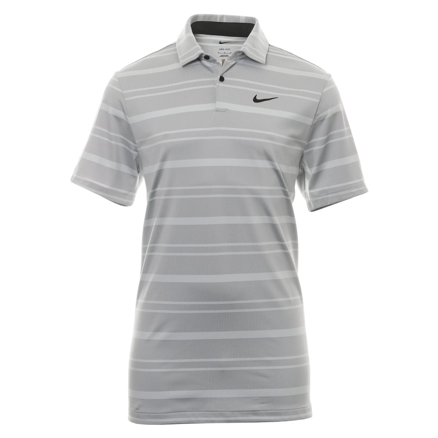 Mens Nike Golf Dri-Fit Tour Stripe Shirt. A shirt constructed using a stretch fabric to produce a highly mobile, moisture wicking garment that features a self fabric collar with perforations for extra breathability. A shorter cut allow this to be worn both tucked and untucked. Nike Dry fabric and Dri-FIT technology moves moisture away from the body, regulates body temperature and keeps you cool and dry.