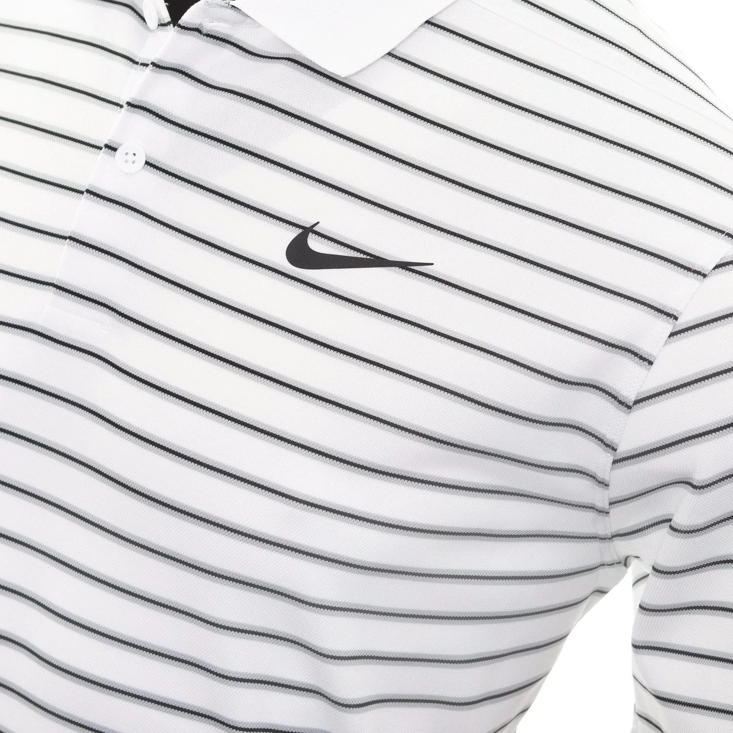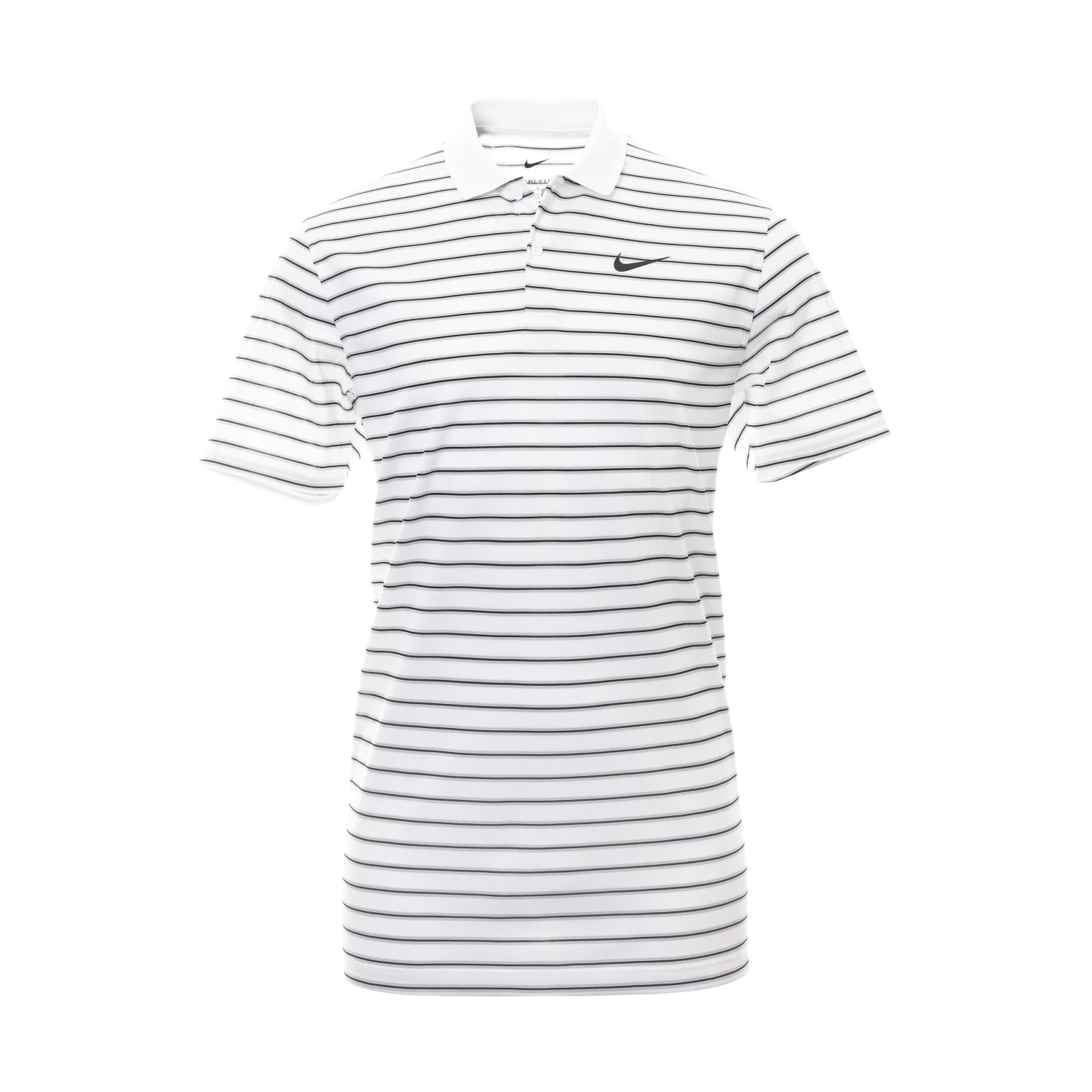 Mens Nike Golf Dri-Fit Victory Stripe Shirt. A shirt constructed using a stretch fabric, to produce a highly mobile garment that features a ribbed collar. Sleeves are finished with a modified set-in armhole and turnback cuff whilst rolled forward shoulder seams allow natural mobility. Nike Dry fabric and Dri-FIT technology moves moisture away from the body, regulates body temperature and keeps you cool and dry.